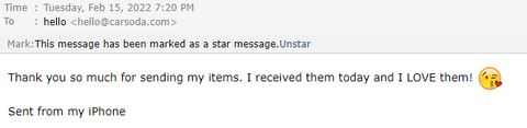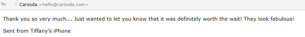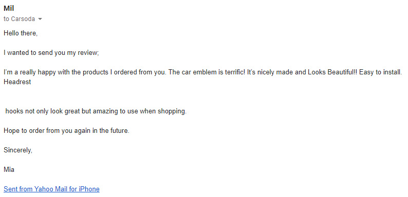 I am so happy with my purchase for the first time with Carsoda. The item is exactly what I expected. I will definitely buy from Liz again. I absolutely adore the steering wheel cover, because it matches the inside of my car to perfection, it is as cute as in the picture. Thanks a ton Carsoda :) ~ Claudia Quevedo
