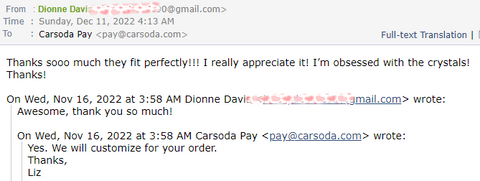Shop owner always responded to my messages and even customized my order with no problems or extra charges! I will be order matching mirror cover next from her!!!