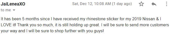 Thank you so much I love it!!!! And it really blings girls with the Nissan this the bling for you and it takes awhile due to custom cuts being done but the customer service was good also keeping me informed thanks again