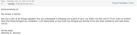 I just received my bling Honda emblem and I absolutely love it! Shipping took a little less than a month but it was totally worth the wait. It truly blings and the 3M sticky tape really secures it. Thank you Car Soda :)