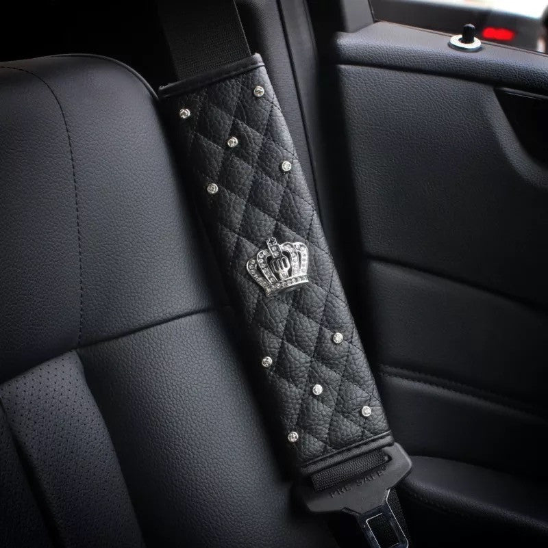 Black Leather Seat Belt Cover with Bling Crown matches beautifully with your crown bling car accessories.
