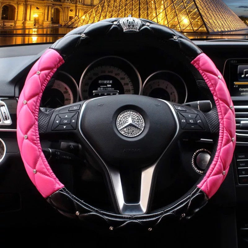 Black and Pink Leather Steering wheel cover with Bling Crown