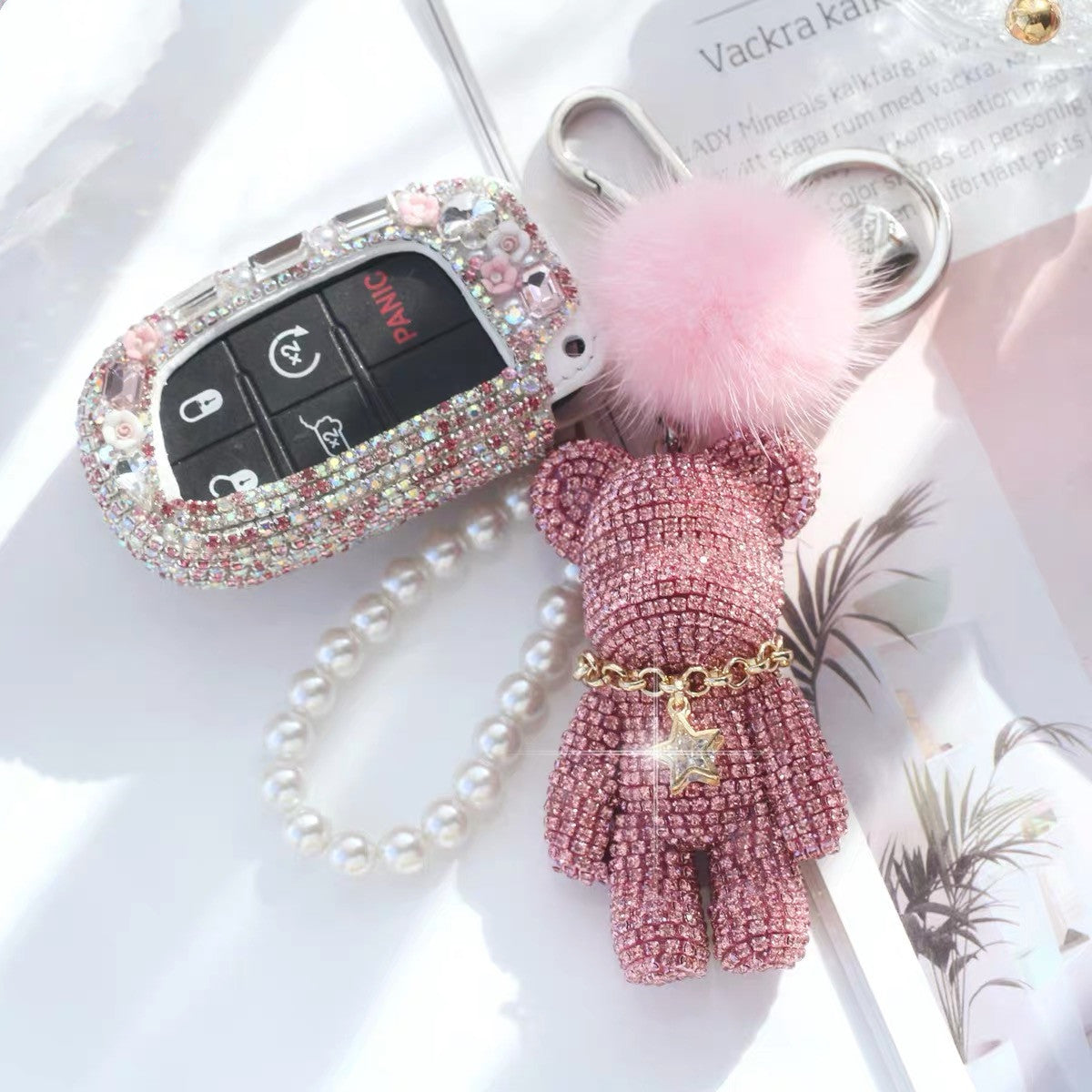 Pink Bling JEEP Dodge Key FOB Leather Cover with Rhinestones- for Cherokee Wrangler Chrysler